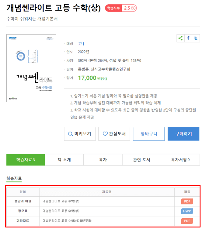 개념 센 라이트의 답지는 기본적으로 무료로 제공됩니다. PDF로 제공되어 프린트하거나 스마트폰에 넣어 확인해 보기가 편리합니다. 교재 목록에서 본인의 수험서를 클릭하면 아래와 같이 구매가 가능한 창이 나오게 됩니다.
