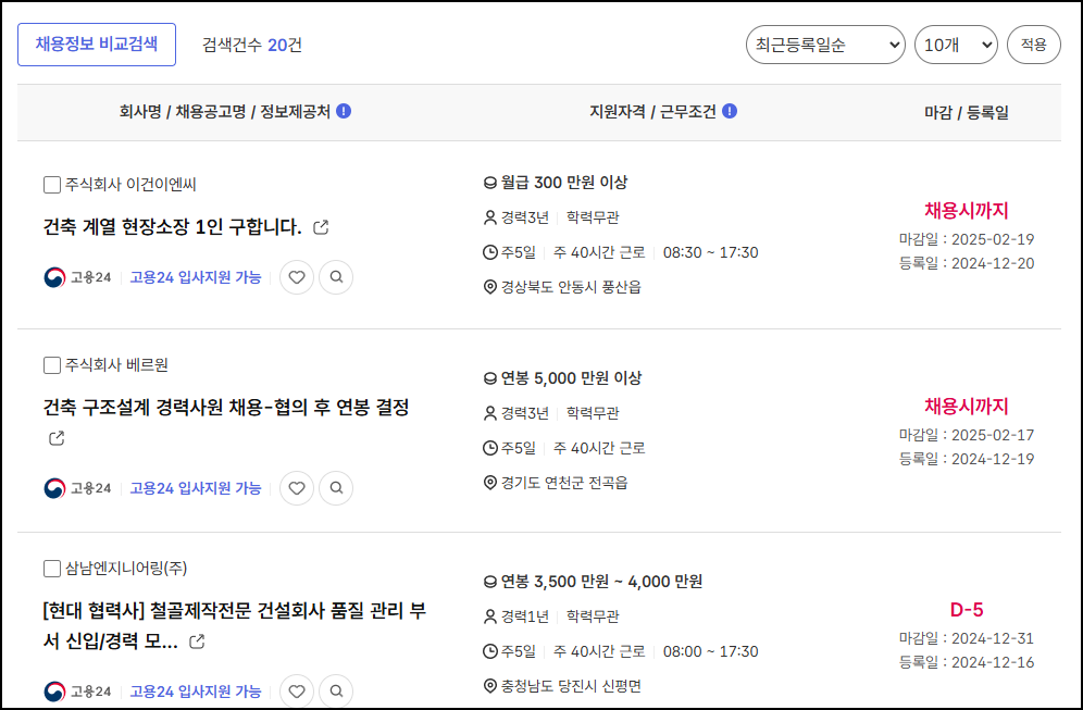 - 주식회사 이건이엔씨 (경북 안동): 건축 현장소장, 월급 300만 원 이상, 주 40시간 근무