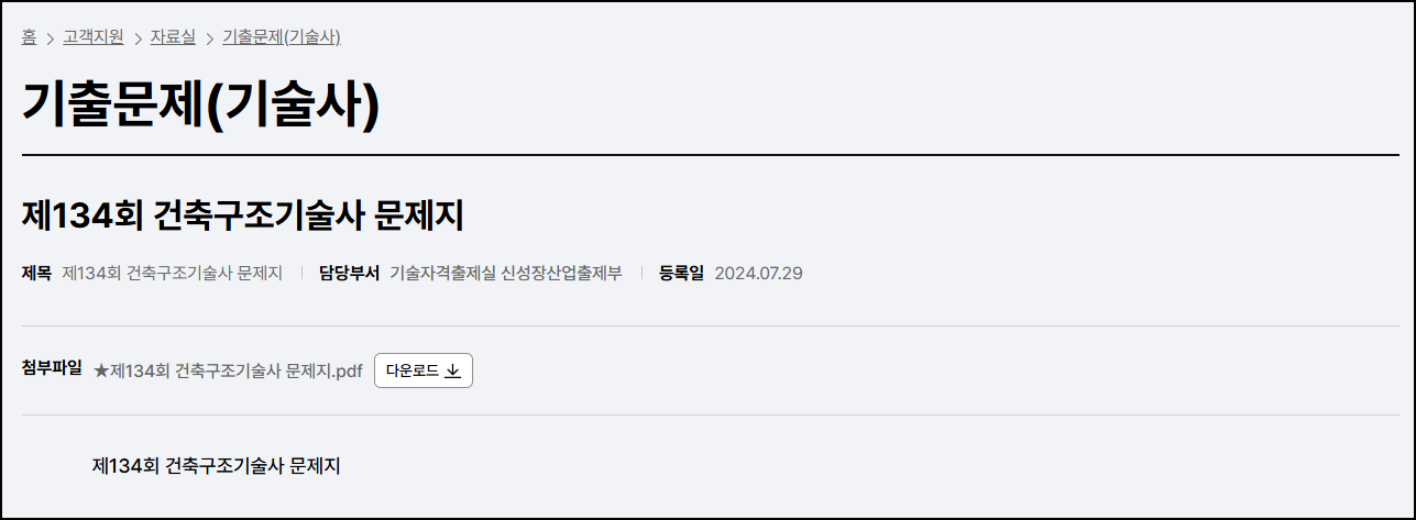 공식홈페이지를 방문하시면 건축구조기술사 공개문제, 출제기준 등을 자세히 확인해 보실 수 있습니다.