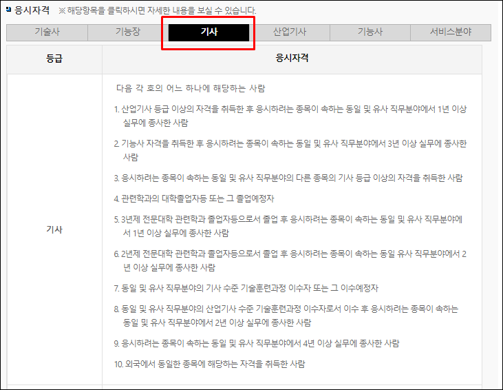 기사의 경우 3년이상 혹은 2년 이상 등의 자격이 필요합니다.