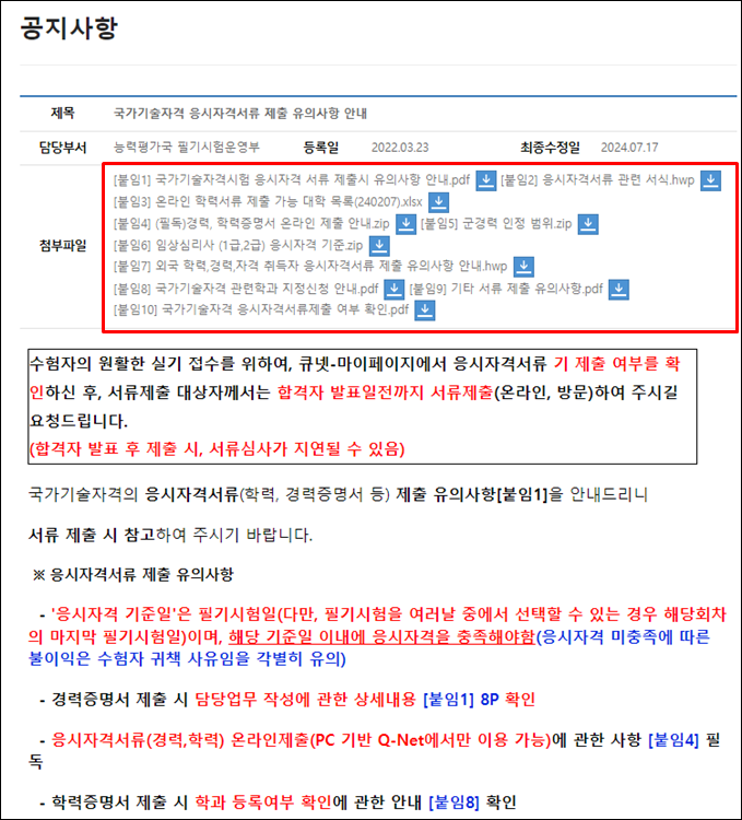 • 응시자격서류 온라인 제출: 경력 및 학력 서류는 PC 기반 Q-Net을 통해 온라인으로 제출해야 합니다. 자세한 사항은 [붙임 4]를 필독하십시오.