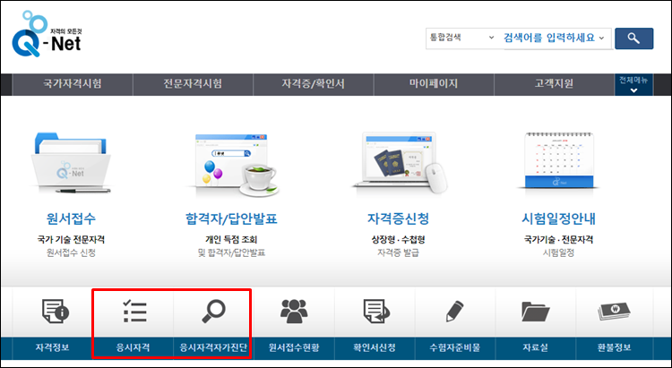 큐넷 홈페이지를 방문하시면 아래와 같이 중앙에 응시자격, 자가진단 아이콘 두가지를 확인해 보실 수 있습니다.