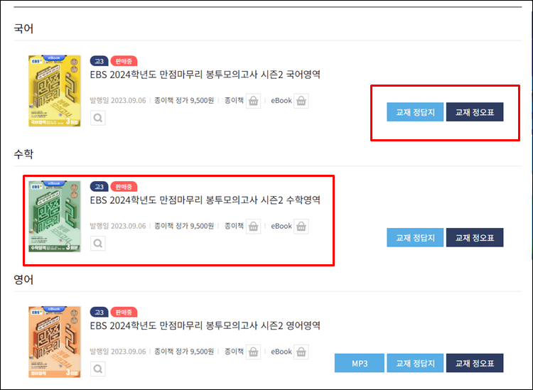 국어, 수학, 영어로 구성되어 있고, 원하시는 문제집을 클릭하셔서 구매하실 수 있습니다.