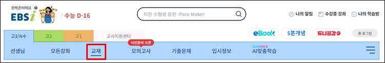 ebs 홈페이지를 가시면 아래와 같이 메뉴에서 교재를 보실 수 있습니다.