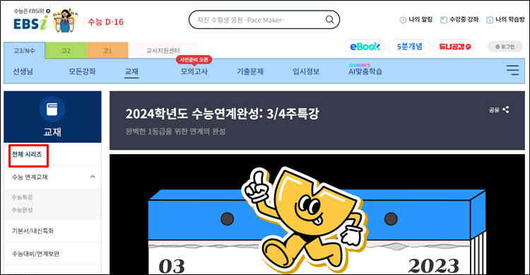고3메뉴에서 교재를 누르시고 전체시리즈를 클릭하시면 아래와 같이 수능연계과정을 보실 수 있습니다.
