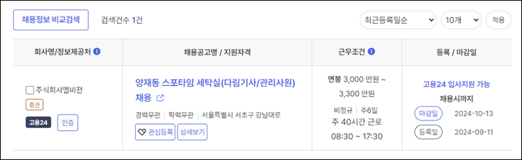 - 주식회사 엘비젼: 스포타임 세탁실 관리사원 채용, 경력 무관, 연봉 3,000~3,300만 원.