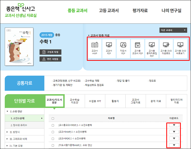 또한 한글파일 교과서, PDF교과서, 지도서, 교사용 교과서, 문제자료집, DVD 등을 다운로드할 수 있어 좋은 자료실입니다. 공통자료와 단원별 자료를 받으실 수 있는데, 공통과정의 경우 원문, 신구 비교표와 함께 교육과정을 비교할 수 있습니다. 또한 교수학습 계획, 정답 및 풀이, 정오표, 평가기준 및 계획안, 학습성취도 점검표가 있습니다.