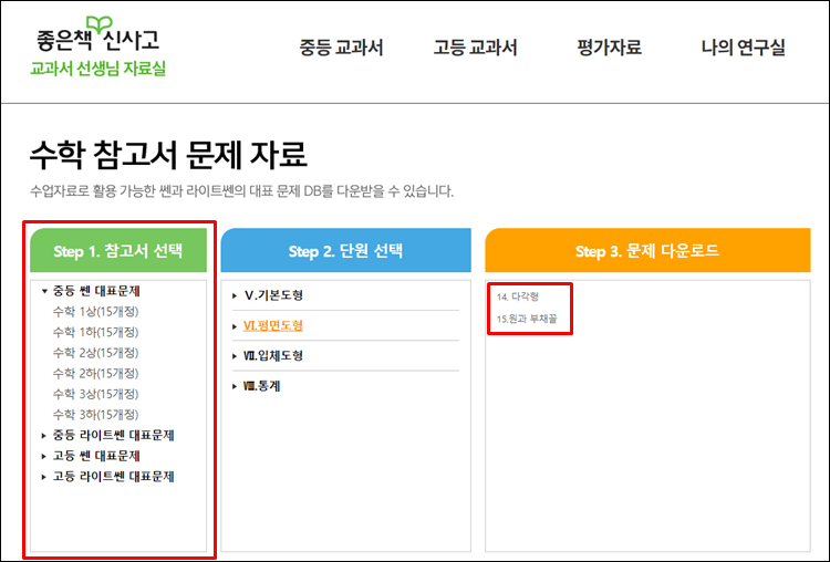 홈페이지에서 선생님자료실을 들어가시면 수학 시험지 출제마법사, 수학 참고서 대표문제, 국어멀티미디어 DB, 문제은행 일괄 다운로드 등이 가능합니다.