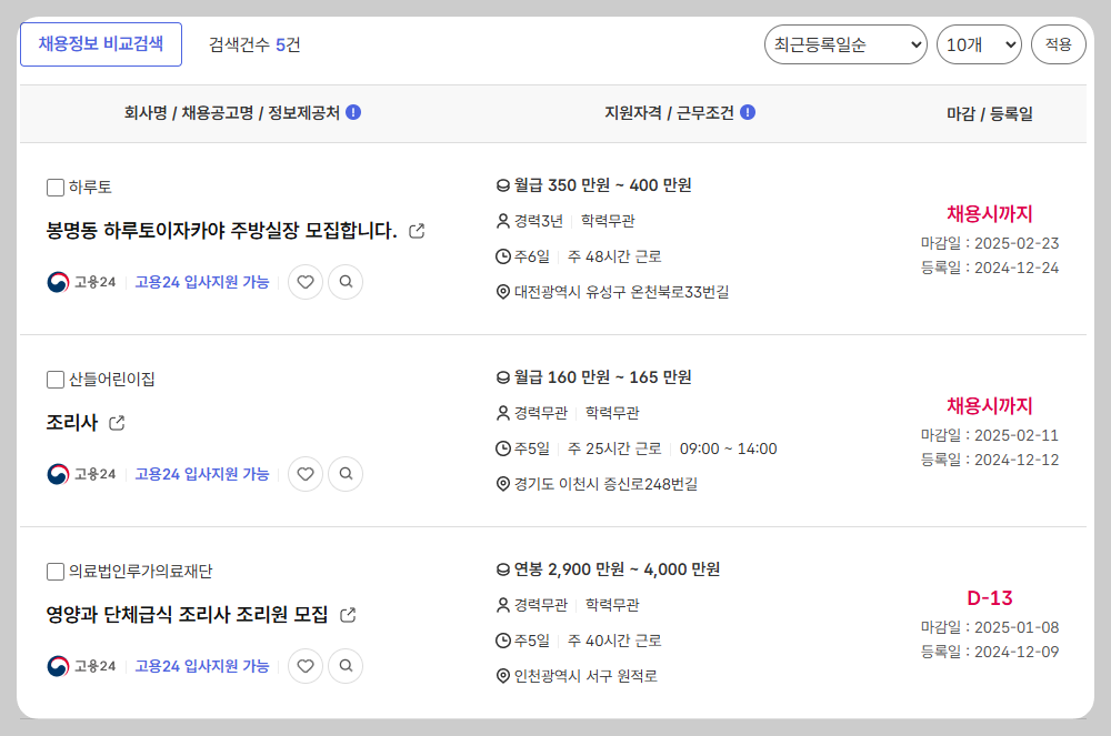 - 의료법인 루가의료재단 (인천 서구): 영양과 단체급식 조리사, 연봉 2,900~4,000만 원, 주 40시간 근무