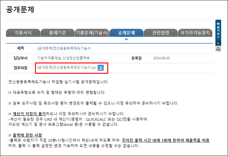현재 전산응용토목제도기능사의 공개문제는 큐넷홈페이지에서 공개하고 있습니다.