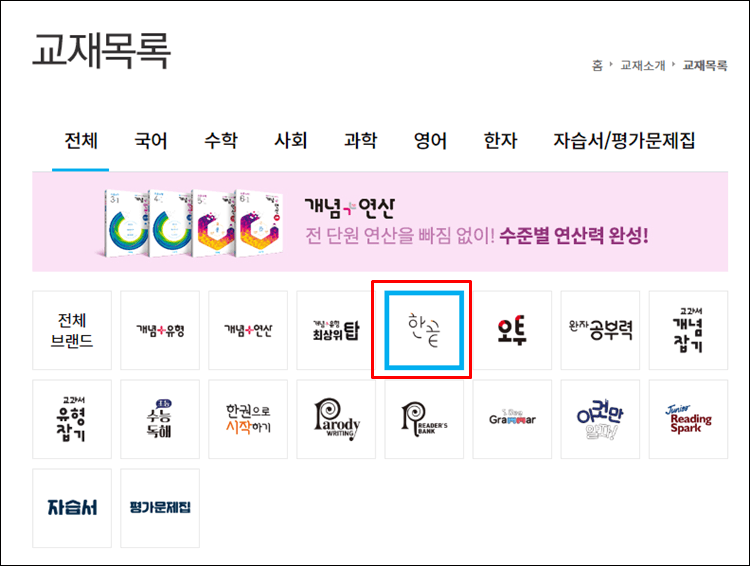 메뉴에서 초등교재 목록을 가시면 아래와 같이 한끝아이콘을 찾아보실 수 있습니다.