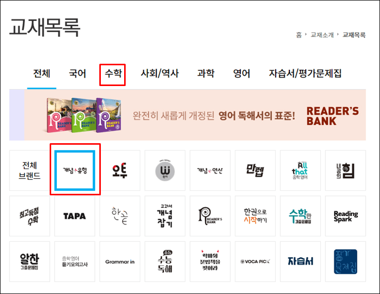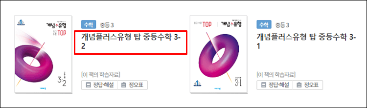 아래와 같이 교재목록에서 수학을 클릭해, 개념플러스유형아이콘을 찾아 눌러보세요.